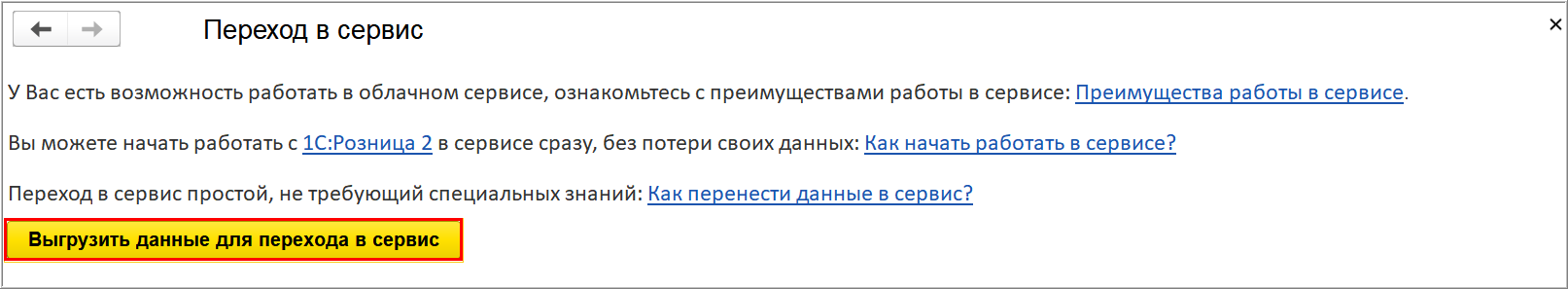 Если настройки отсутствуют, то при нажатии ссылки Переход в сервис раздела Администрирования откроется одностраничная форма с кнопкой Выгрузить данные для перехода в сервис.