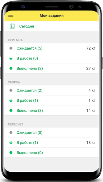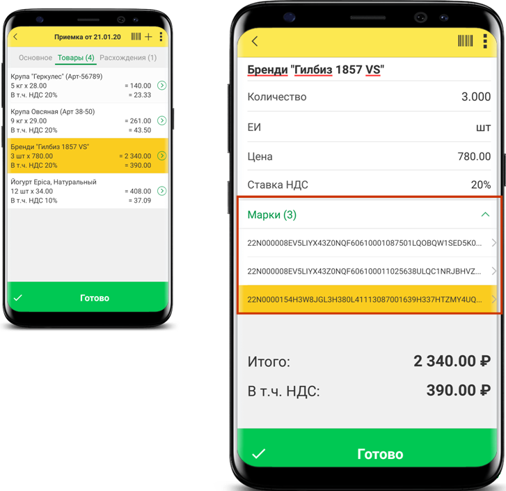 При работе в мобильном приложении, кладовщик вводит фактическое количество товаров в полученный из учетной программы документ. Для определения товарной позиции можно использовать промышленный штриховой код и вводить, в случае необходимости, серийный номер продукции. Для маркированной продукции предоставляется возможность сканировать индивидуальные марки установленного формата. Вся введенная информация сохраняется в документе, который передается в учетную программу.