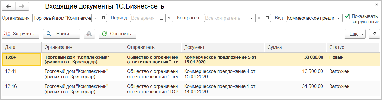 Коммерческие предложения поставщиков в зависимости от способа отправки отражаются в «Текущих делах ЭДО» или «Входящих документах 1С:Бизнес-сеть».
