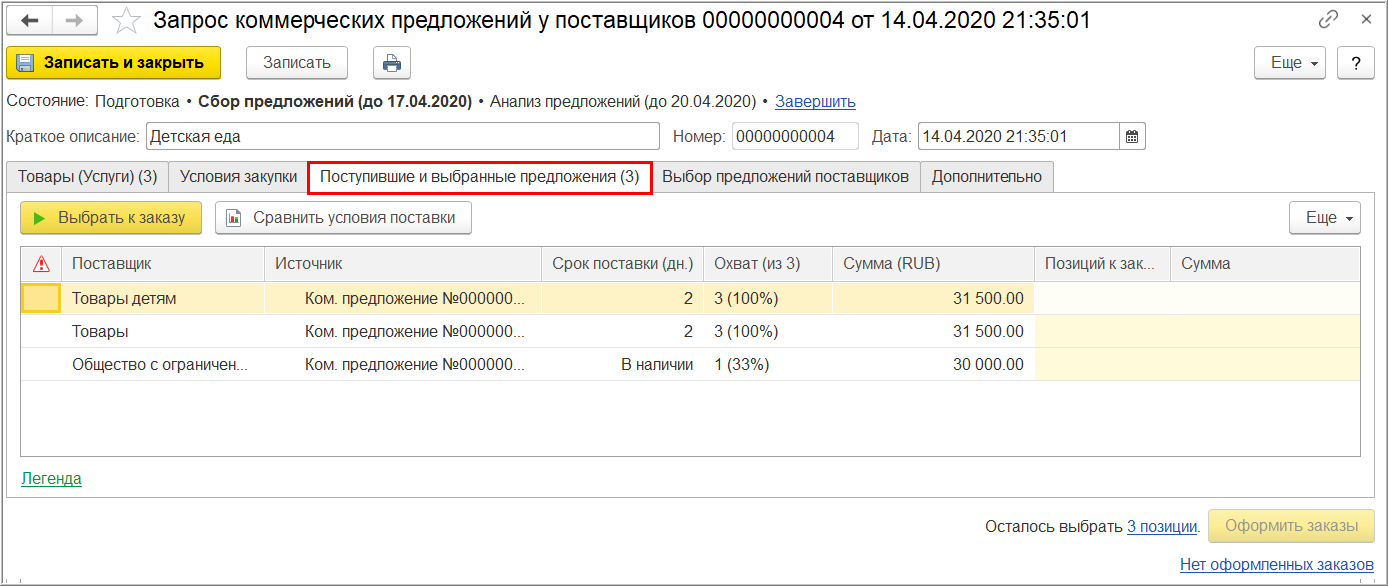 Загруженные коммерческие предложения отражаются на вкладке Поступившие и выбранные предложения.