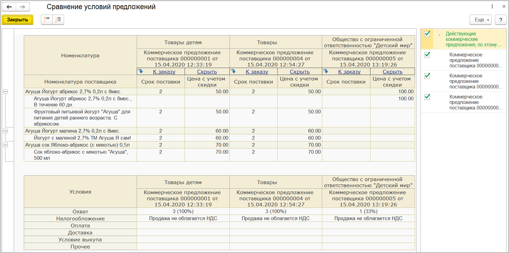 Со вкладки Поступившие и выбранные предложения с помощью кнопки Сравнить условия поставки можно перейти к отчету, который позволит сравнивать условия поступивших предложений.