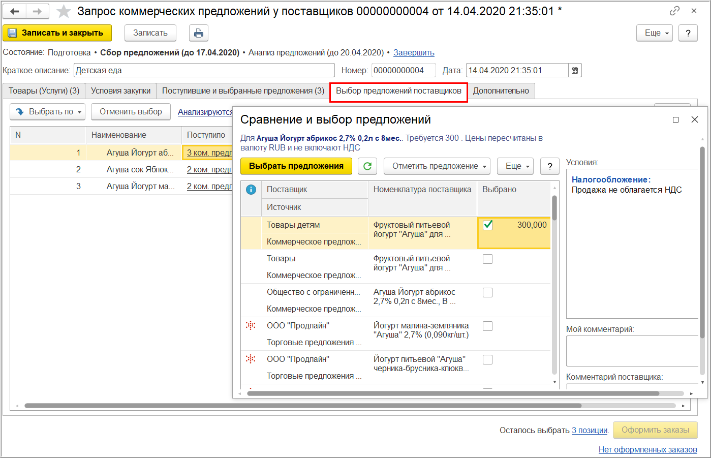 Наряду с коммерческими можно выбрать и торговые предложения поставщиков в соответствии с исходным запросом коммерческого предложения (при включенном анализируемом источнике Торговые предложения 1С:Бизнес-сеть).