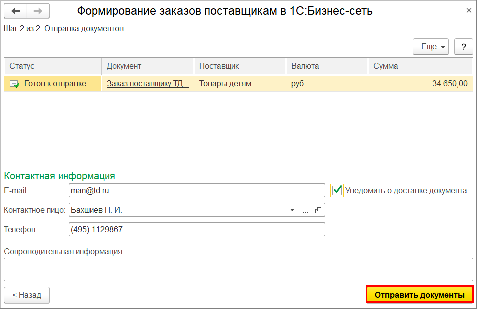 Отправить поставщику созданные документы можно через «1С:Бизнес-сеть» или сервис «1С:ЭДО.