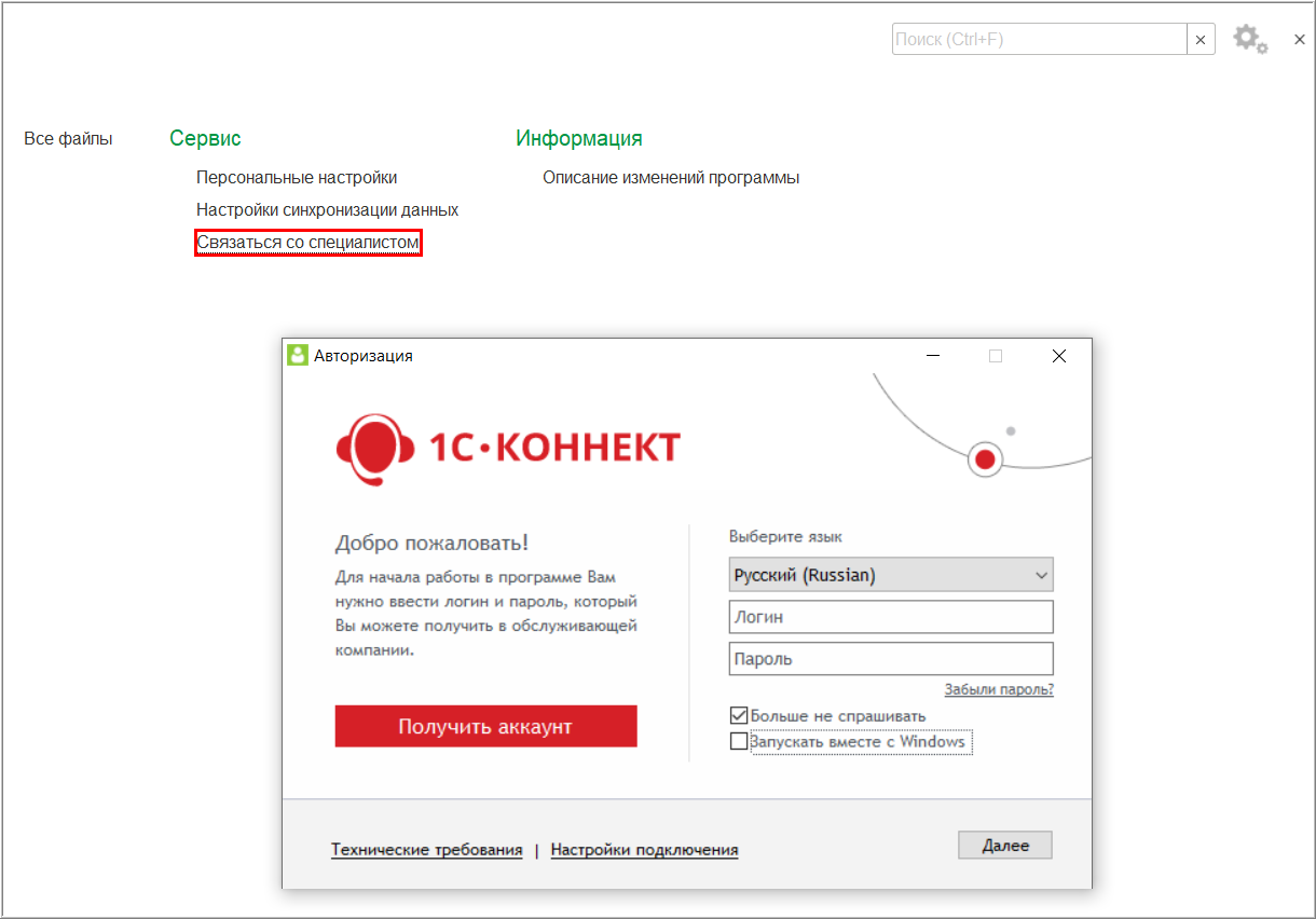 Обратиться к техническому специалисту из программы «1С:Розница» можно перейдя в раздел Главное и нажав ссылку Связаться со специалистом. Приложение будет запущено автоматически.