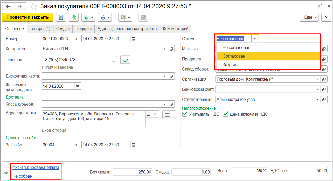 Работа со статусами согласования осуществляется в ручном режиме. При загрузке в программу документ Заказ покупателя имеет статус Не согласован. После того, как оператор связался с покупателем и уточнил детали по заказу (например, дату, время, адрес доставки пр.), статус документа следует сменить на Согласован. Операции над документом станут доступны пользователю.