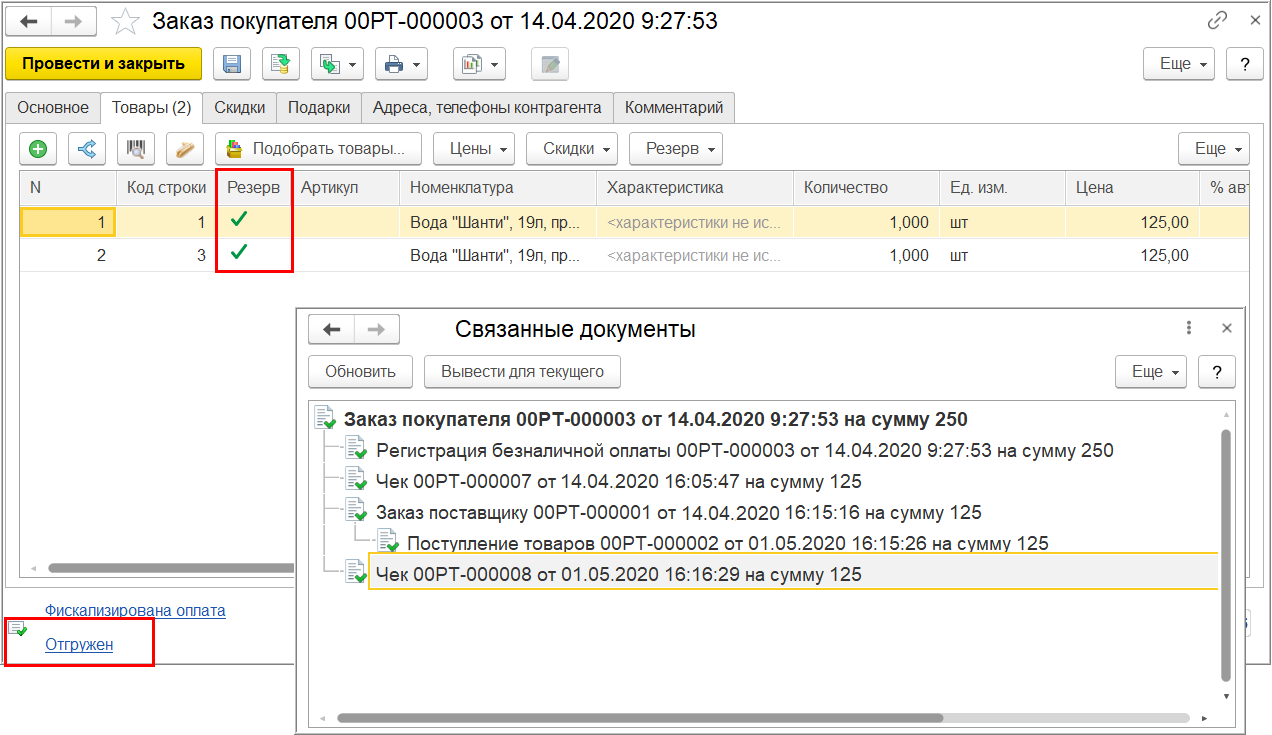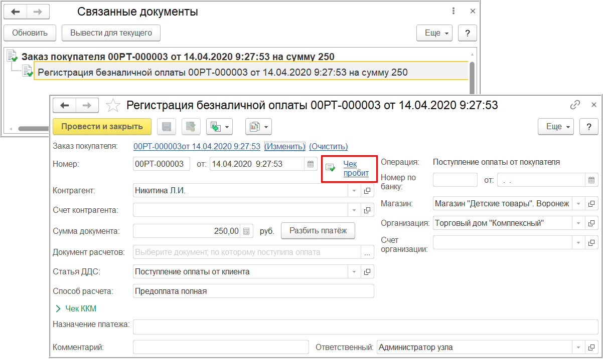 Если была предоплата на сайте, то документ Заказ покупателя будет загружен в программу в состоянии Фискализирована оплата. Одновременно автоматически будет создан подчиненный документ Регистрация безналичной оплаты с признаком Чек пробит.