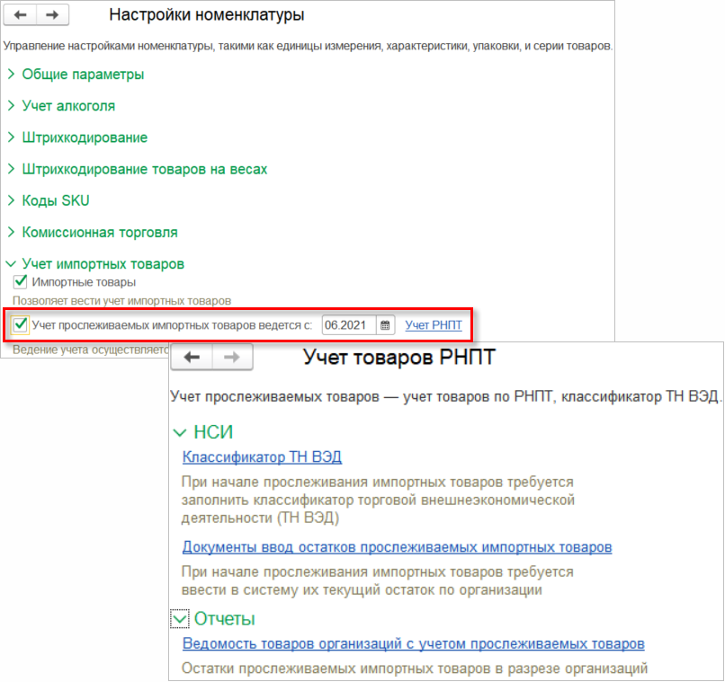 На панели Администрирование – Настройки номенклатуры – Учет импортных товаров добавились настройки учета прослеживаемости.