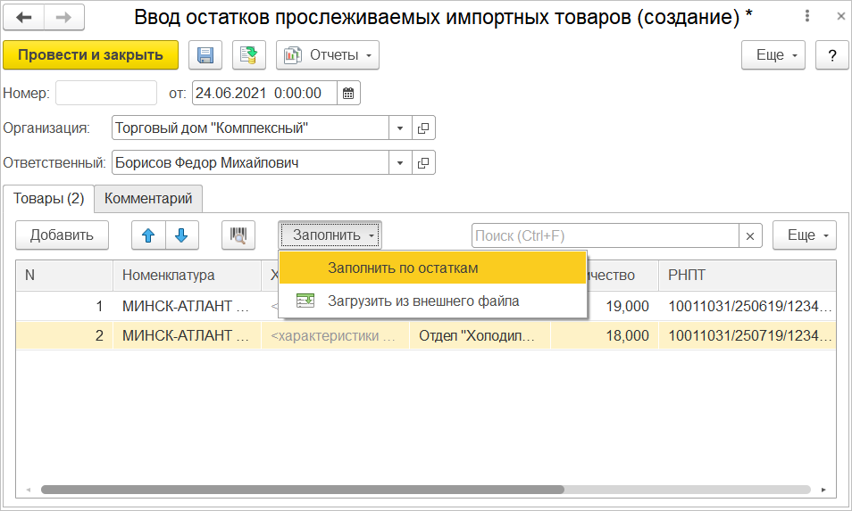 Документ ввода остатков прослеживаемых импортных товаров можно создать и заполнить вручную и автоматически - с помощью команды Заполнить по остаткам.