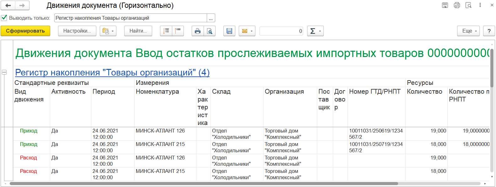 В движениях документа видно, что для прослеживаемого товара списываются все имеющиеся остатки, а новые товары добавлены с учетом номера РНПТ.