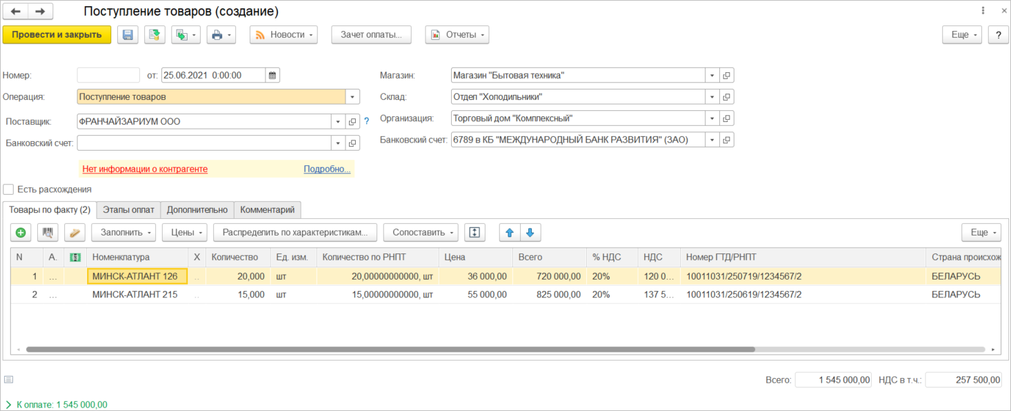 В документах, содержащих прослеживаемые товары, появились новые показатели: Количество по РНПТ, Номер ГТД/РНПТ. При ручном вводе документов поступления пользователь может их заполнить самостоятельно.