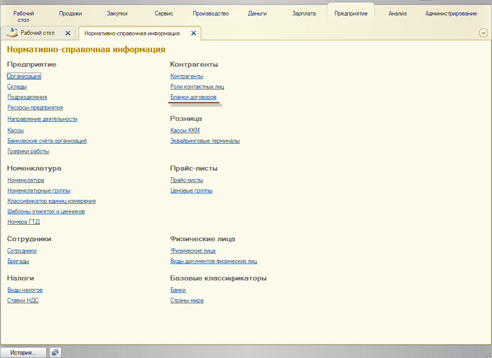 Переход к списку бланков договоров осуществляется из раздела Предприятие - Справочники (Нормативно-справочная информация).