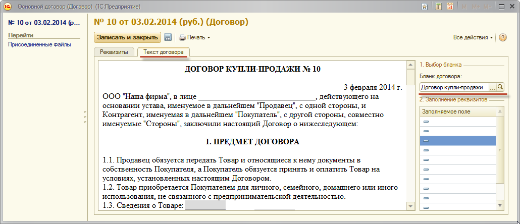 В конфигурацию включены четыре готовых бланка (бланк договора аренды, купли-продажи, оказания услуг, поставки). Эти бланки можно их изменять и копировать.