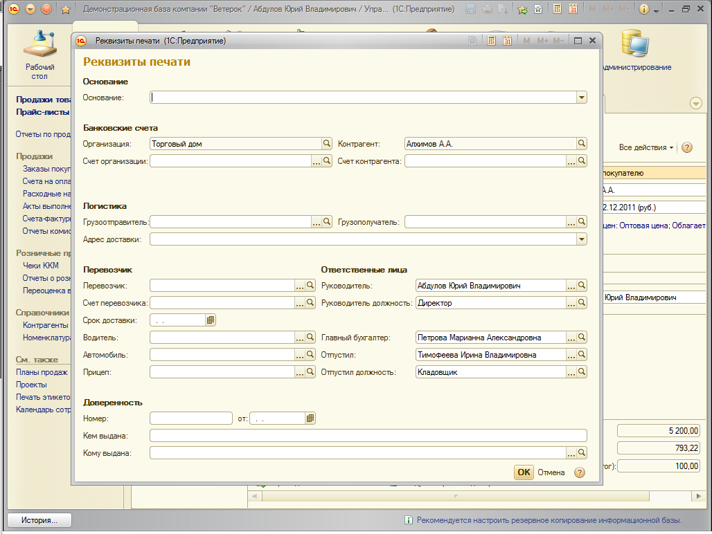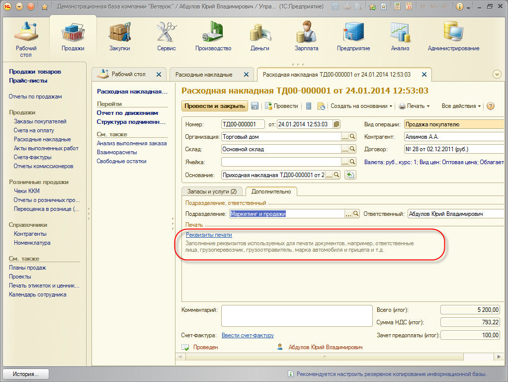 Начиная с версии 1.4.8 в указанных документах на закладке Дополнительно добавлена ссылка Реквизиты печати.