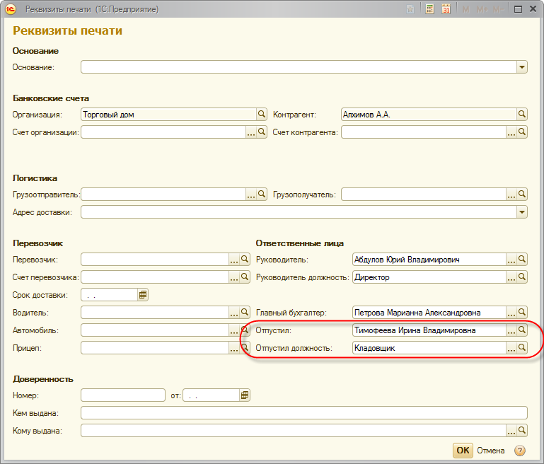 Изменена логика заполнения полей печатных макетов Отпустил. Раннее данное поле заполнялось только из ответственных лиц организации, на текущий момент кладовщика можно указывать непосредственно в документе, заполнив реквизиты Отпустил и Отпустил должность.