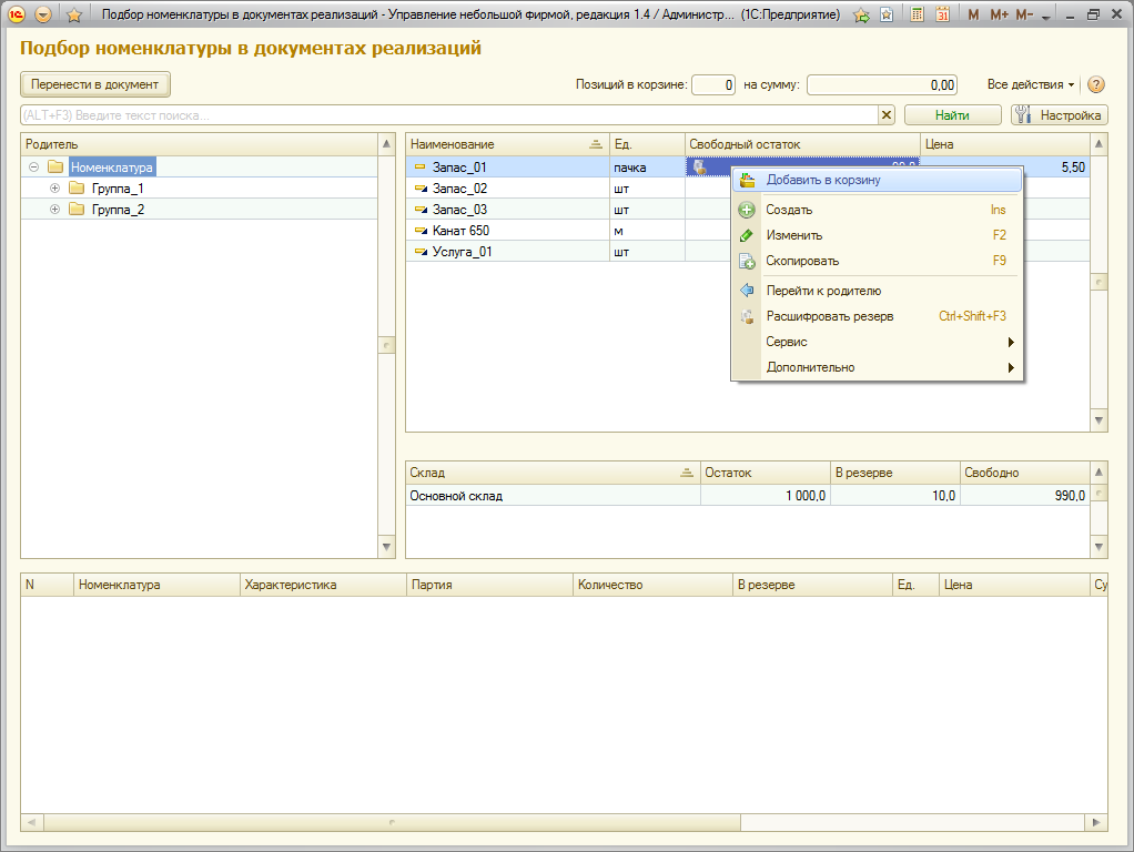 Добавлена новая форма подбора номенклатуры для документов продаж и закупок. К основным возможностям формы относятся: