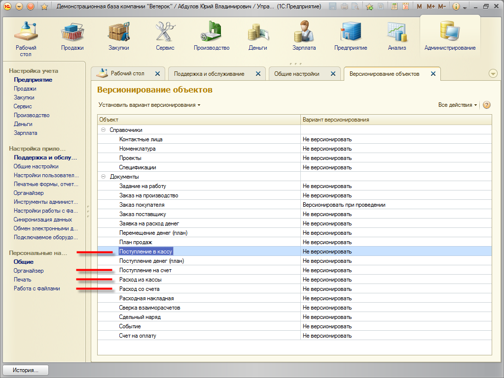 К подсистеме Версионирование объектов подключены документы отражающие поступления и расход денежных средств со счета и из кассы.