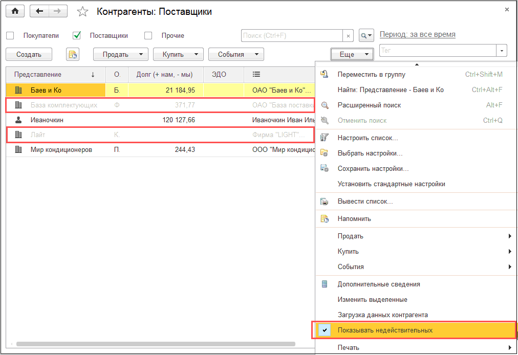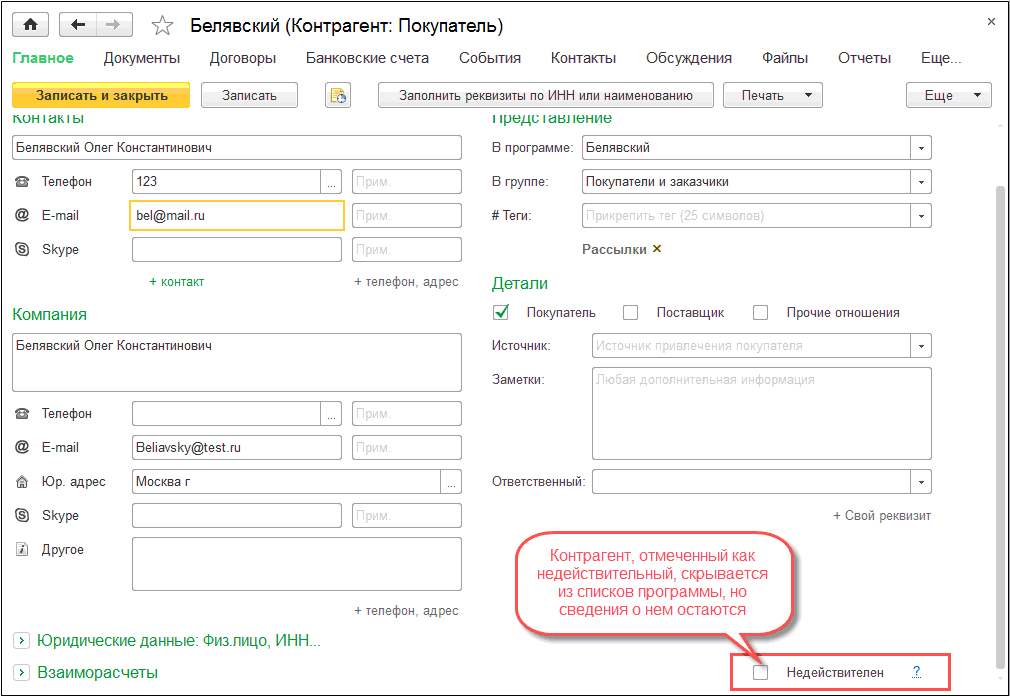 Аналогичным образом, можно указать и недействительных контрагентов или их контактных лиц.