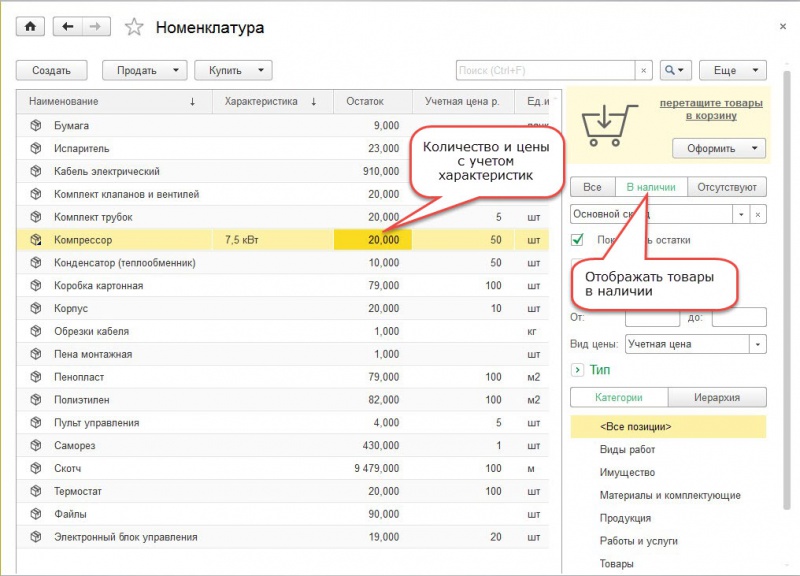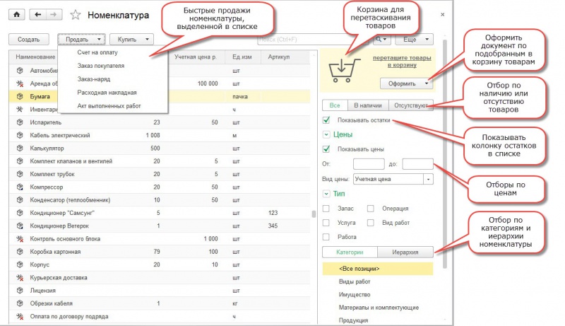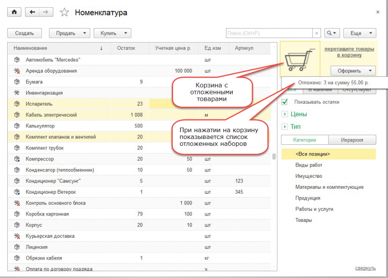 Список номенклатуры стал полноценным рабочим местом: корзина, остатки и цены, фильтры, оформление документов!