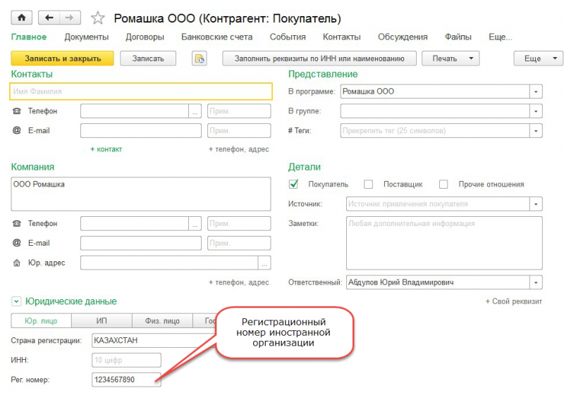 Теперь в карточке контрагента можно указать регистрационный номер для иностранной организации, присвоенный в стране её регистрации.