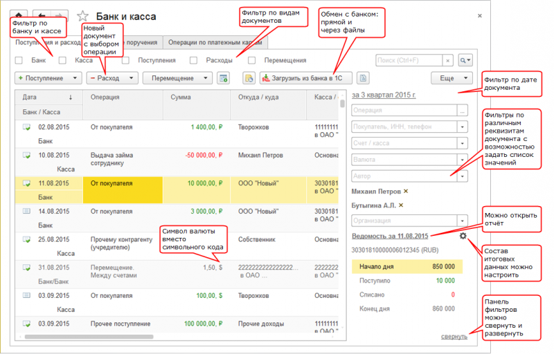 Переработаны документы «Поступление на счет», «Расход со счета», «Поступление в кассу», «Расход из кассы» и «Операция по платежным картам».