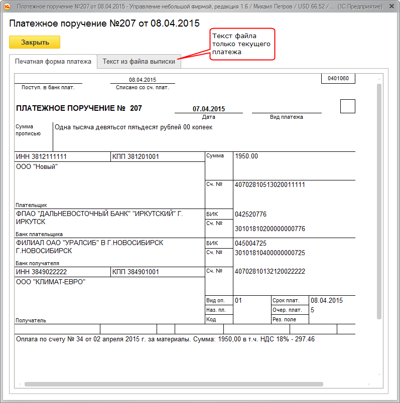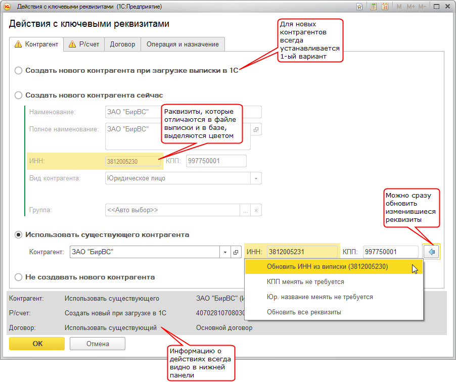 Для любого платежа можно открыть помощник по работе с контрагентом, расчётным счётом, договором и операцией.