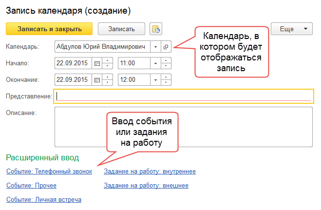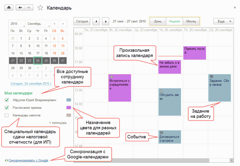 Для каждого сотрудника автоматически создается персональный календарь, а также возможно добавление произвольного календаря. Каждый пользователь может назначить предпочитаемый цвет записей для доступных ему календарей. Доступность календаря для сотрудников задается в карточке календаря.