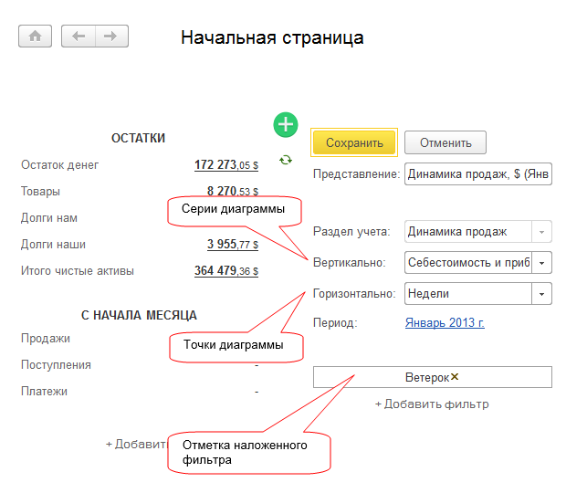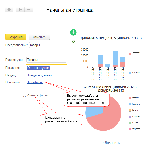 На нём можно разместить выбранные из широкого перечня настраиваемые показатели и диаграммы. Поддерживается вывод показателей денежного и товарного учета, взаиморасчетов, продаж и финансового анализа.