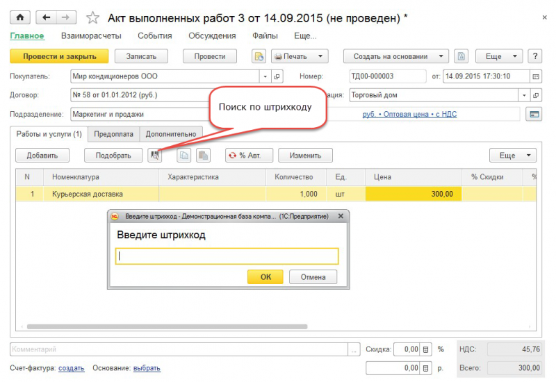 Теперь можно использовать сканер штрихкодов для подбора услуг в документ «Акт выполненных работ» и работ в документ «Заказ-наряд».