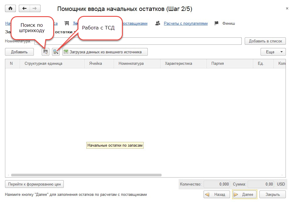 Теперь можно использования сканер штрихкодов и терминал сбора данных для заполнения документа «Ввод начальных остатков»