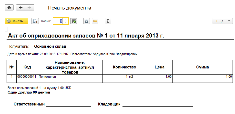 В ней выводится перечень оприходованных запасов и поля для подписей ответственных лиц.