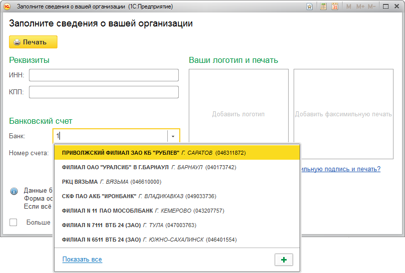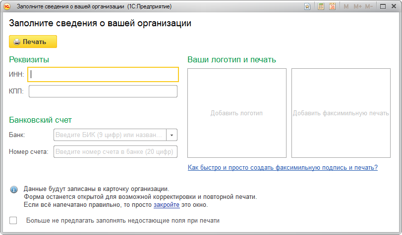 Перед выводом счета на печать программа сама предложит заполнить недостающие поля, такие как ИНН, КПП, банк, номер счета, логотип и факсимильная печать.