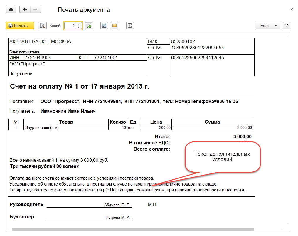 Добавлена возможность указать дополнительные условия в документе «Счет на оплату».