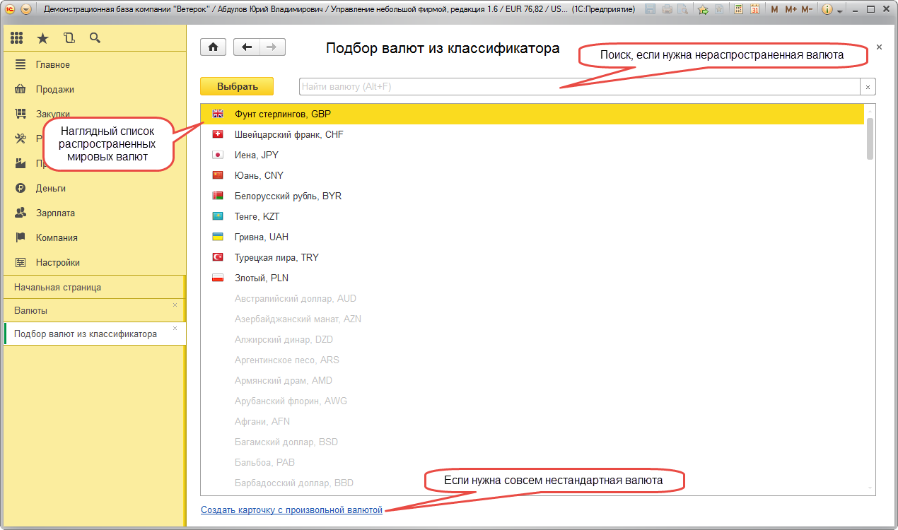 Также предусмотрена возможность создать валюту не из классификатора. Ссылка для создания произвольной валюты находится в нижней части формы.
