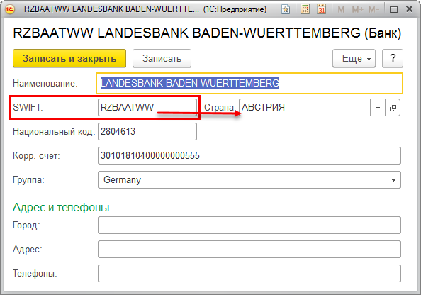 При вводе SWIFT система автоматически определит Страну банка. Выбранная Страна банка влияет на видимость реквизитов в банке, банковском счете и на состав проверок банка и банковского счета.
