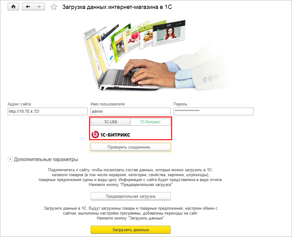 Введите информацию для подключения к сервису (Адрес сайта, с которого будет происходить загрузка, Имя пользователя и Пароль).