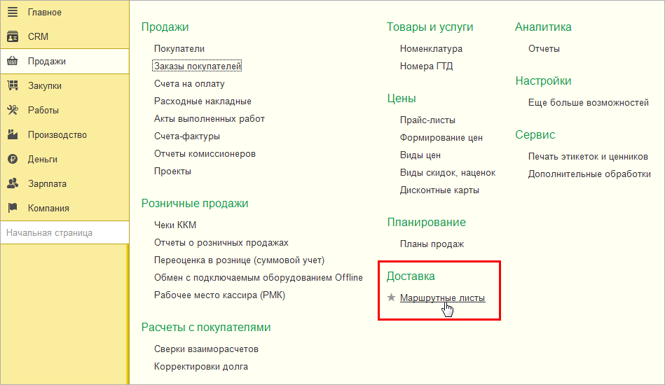 Для управления процессом передачи заказов курьеру в версии 1.6.10 добавлен документ Маршрутный лист. Сформировать Маршрутный лист можно из журнала Маршрутные листы (раздел Продажи - Доставка).