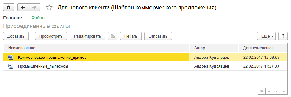 Файл коммерческого предложения будет сохранен на вкладке Файлы. Из данной формы файл можно повторно открыть для просмотра и редактирования, распечатать или отправить по почте.