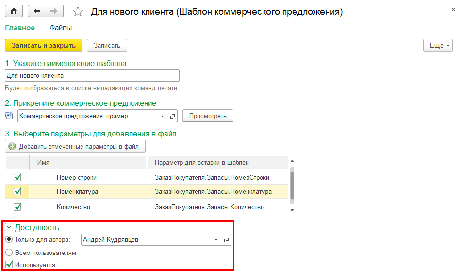 В шаблоне коммерческого предложения можно ограничить доступ к шаблону пользователей, кроме автора. Чтобы скрыть неактуальные шаблоны необходимо снять флаг Используется.