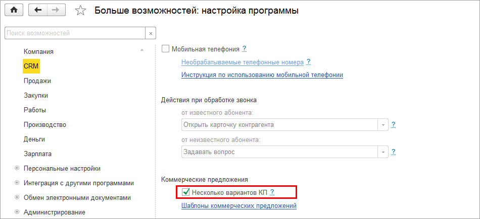 В рамках одного Заказа покупателя возможно создать несколько коммерческих предложений клиенту. Включить использование нескольких вариантов коммерческих предложений клиенту можно в настройках раздела CRM (Еще больше возможностей — Несколько вариантов коммерческих предложений).