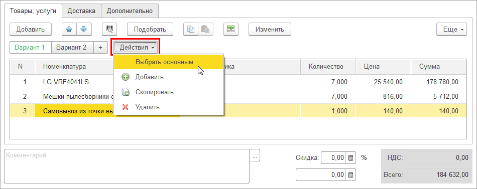 Установить основной вариант, а также скопировать или удалить вариант поможет кнопка Действия.