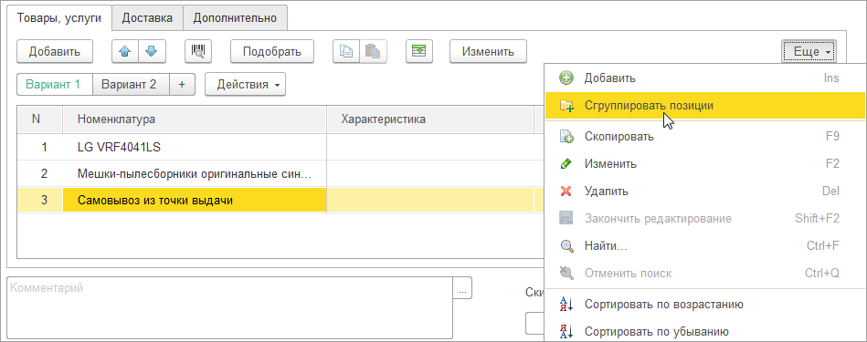 Для удобства работы с коммерческими предложениями добавлена возможность группировки строк табличной части документа Заказ покупателя.