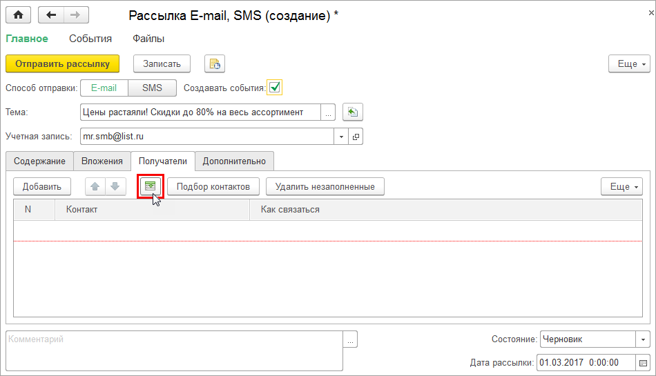 Рассылка e-mail и SMS сообщений осуществляется из документа Рассылка E-mail, SMS (раздел CRM). Загрузку контактов для рассылки можно выполнить на вкладке Получатели.