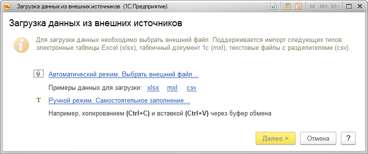 При нажатии на кнопку, будет открыта стандартная обработка Загрузка данных из внешних источников. Поддерживается импорт из файлов следующих типов: *.xlsx, *.mxl, *.csv