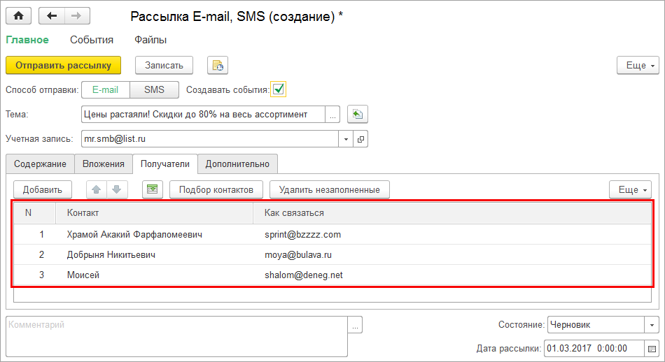 В результате загрузки, будут заполнены колонки Контакт и Как связаться табличной части Получатели.