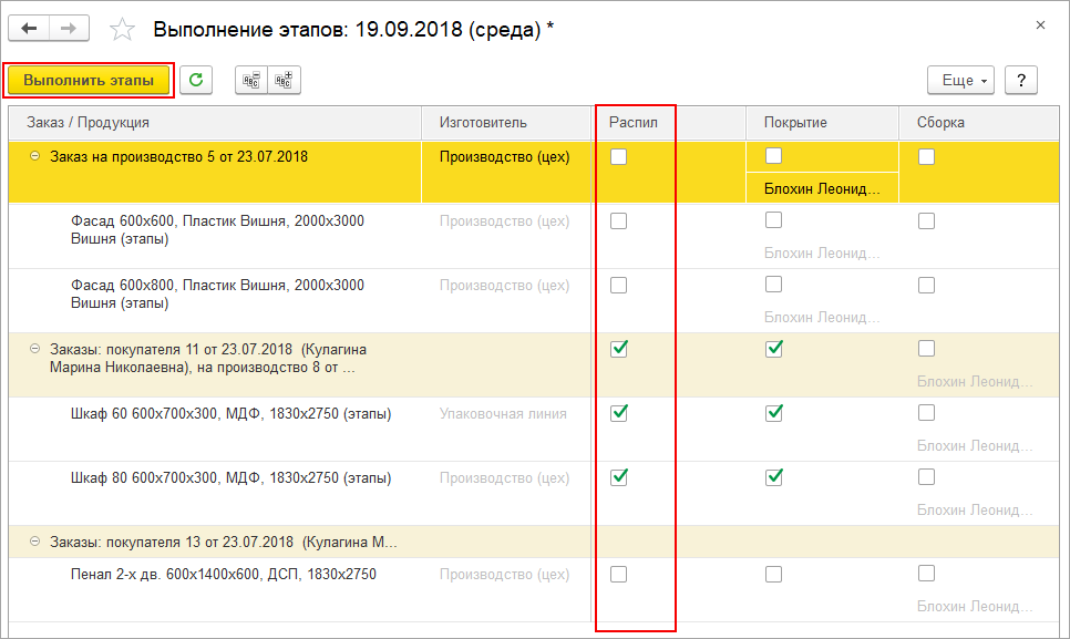 С помощью команды заполнения Выполнить этап можно отметить этап для выполнения (установить флажок) сразу для всей отображаемой продукции.