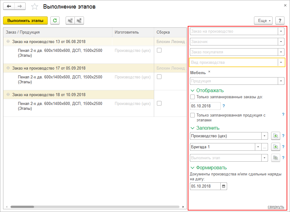 Важно! В автоматизированное рабочее место Выполнение этапов попадет только продукция с заполненной спецификацией из незавершенных заказов, проведенных после включения опции Использовать производство в несколько этапов.