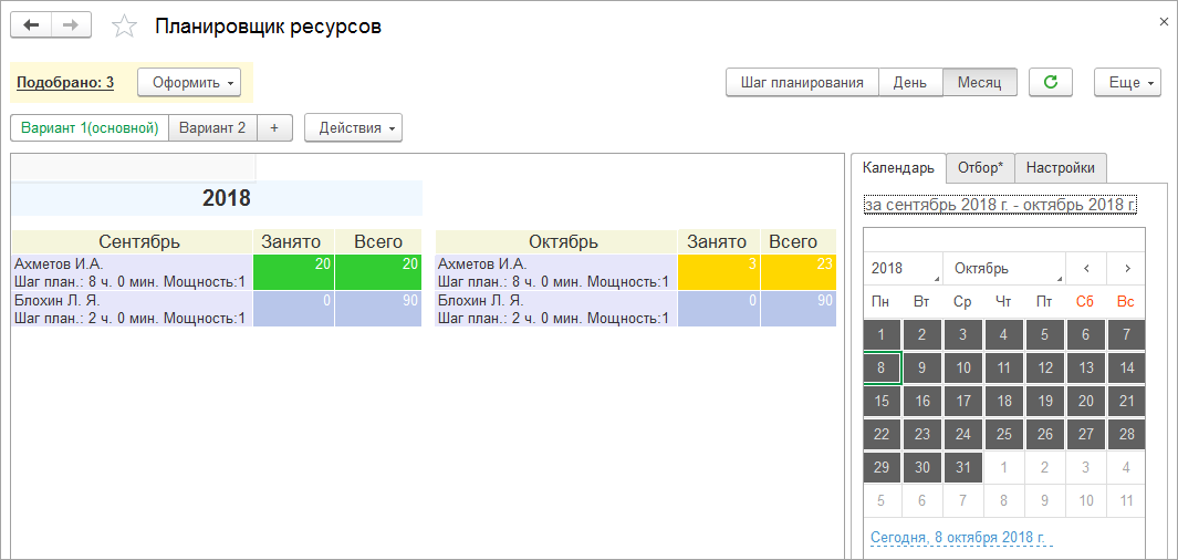 Режим планировщика Месяц позволит оценить общую загрузку ресурсов за период и сравнить между собой загрузку в разные месяцы, выявить сезонность.