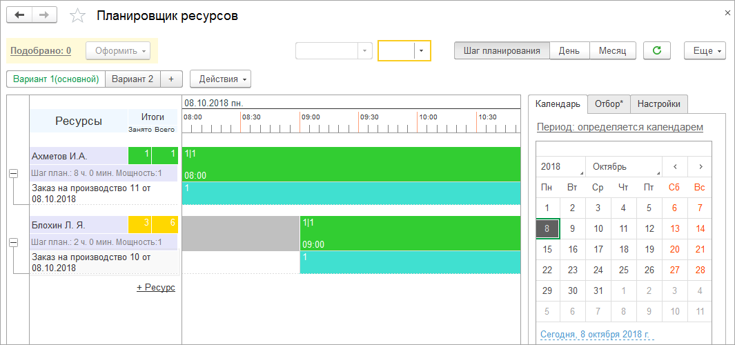 Изменился внешний вид планировщика – в нем появилась удобная навигация по периодам, различные отборы по ресурсам, видам ресурсов, контрагентам и документам, цветовая индикация загрузки ресурсов.