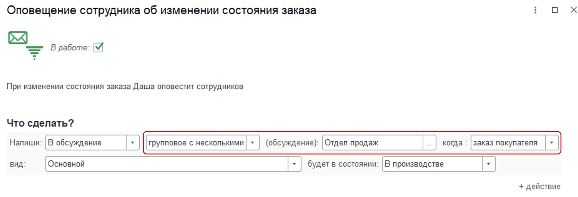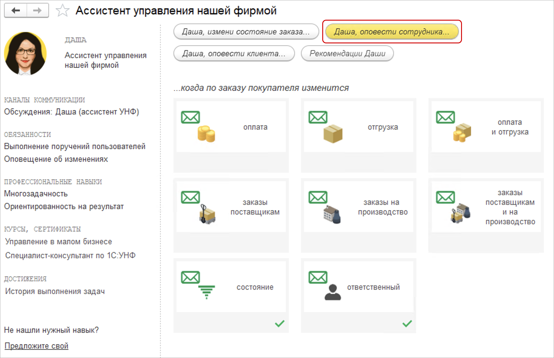 Теперь ассистент Даша помогает в онлайн-продажах, работая с заказами из мобильного приложения и сайта. Сообщает о появлении нового заказа в обсуждении, письмом на электронную почту или sms. Даша сообщит, когда необходимо приступать к работе, если сотрудник начинает работать с определенного состояния заказа, а также о назначении его ответственным за заказ.