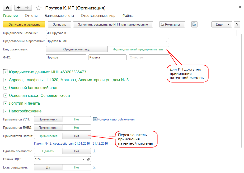 Для индивидуального предпринимателя добавлена возможность ведения учёта по патентной системе налогообложения.